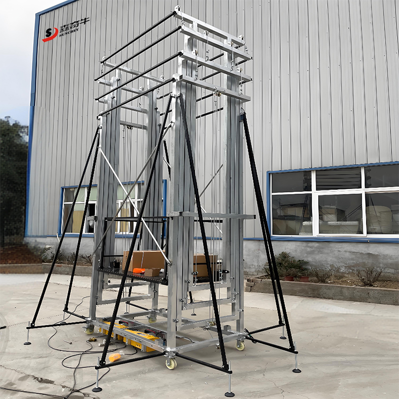Control system: including control box, buttons, limiters and other components. The control box receives the control signal of the operator and controls the movement of the electric scaffolding through the circuit and solenoid valve. The limiter monitors the movement of the platform and sends a signal when it reaches the set upper and lower limits to stop the movement of the platform.